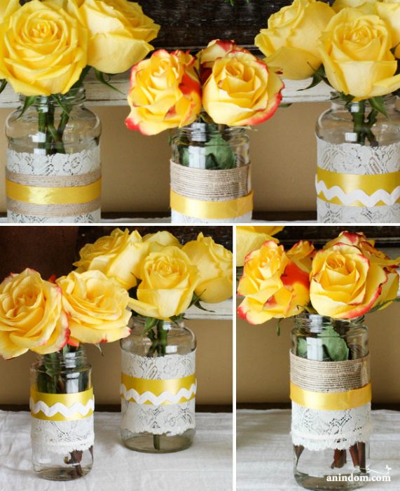 Вазы из обыкновенных банок, декорированных кружевом и лентами