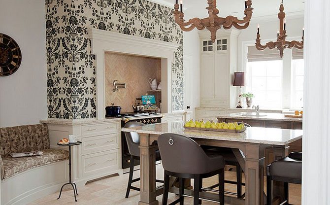1.Белые обои с неброским рисунком сделают вашу кухню светлой и спокойной.
