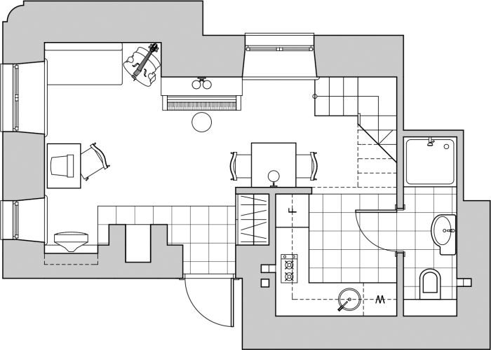 Нельзя оставить без внимания тот факт, что помимо всех функциональных зон в этой крошечной квартире удалось найти место для пианино и контрабаса, без которых владелец апартаментов не представляет своей жизни. Наряду с ними выделяется и массивный камин. Так как дому уже больше ста лет, убирать такое украшение было бы просто кощунством. Чтобы сбалансировать пространство, напротив камина установили зеркальную дверь (там как раз располагается гардероб).