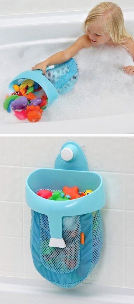 С детской разобрались, но есть ещё ванная комната. Резиновые уточки, рыбки и дельфины превращают купание ребёнка в увлекательную игру, а уборку для родителей — в кошмар. Чтобы не собирать утят по всей ванной и не хранить их рядом с зубными щётками или косметикой, купите для них маленькую сетку. Она не промокает и чаще всего крепится к стене на присоске — очень удобно.