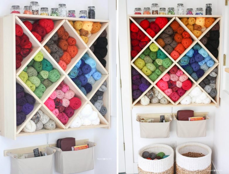 Ещё одна головная боль рукодельниц — пряжа. Конечно, если у вас всего несколько клубков, их можно держать в ящике, коробке или корзине, но что делать, если вы занимаетесь вязанием профессионально и пряжи у вас — хоть отбавляй? Как раз для таких случаев мы нашли потрясающую идею: поместить все клубки в винную стойку. Внутри их можно рассортировать, например по цветам, а на саму стойку поставить баночки или коробки со всем необходимым: пуговицами, спицами и т.д.