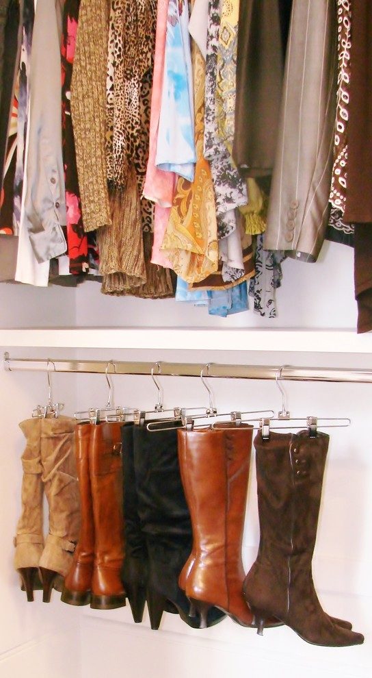 Часто высокая обувь — ботинки или сапоги — не влезает в обычную коробку, а если и влезает, то мнётся, будучи долгое время сложенной. В этой ситуации оптимальным решением станет хранение высокой обуви на обычных вешалках с прищепками, которые продаются в любом магазине. Организовать их можно на нижнем ярусе в гардеробной или прямо в коридоре.