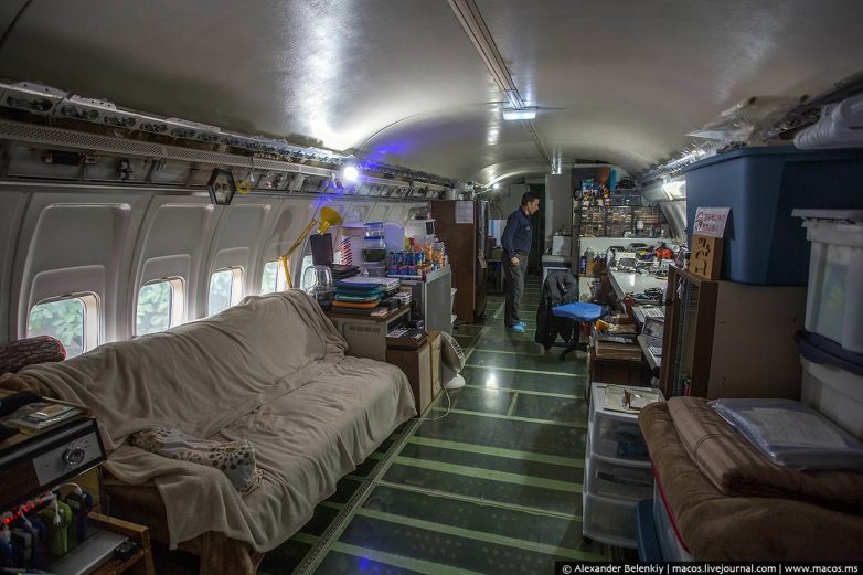 Брюс не стал строить стены, разделяя единое пространство Боинга на комнаты. Всё уместилось в длинной “сосиске” фюзеляжа.
