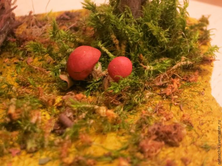 Посадим дерево на клеевой пистолет. Пока клей застынет, можно подпереть его веточкой. Клей у основания декорируем мхом. Ребенок в это время может слепить грибы. Можно еще добавить кустики и лавочку, но у нас время поджимало.