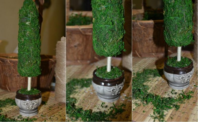 Когда елочка стала полностью зеленой, скатываем ее в руках, чтоб мох плотнее прилегал.