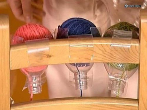 К примеру, приспособление для вязания из пластиковых бутылок, чтобы нитки не путались между собой, можно легко и быстро сделать самим. Это всего лишь небольшая хитрость, а результат получается превосходный. От полуторалитровой бутылки полностью отрезается донышко и в боковой стенке вырезается широкая лента не доходя до горловины см 1. В результате получается горловина с широкой лентой. Затем, отступив от края 2 см., на конце ленты делается круглая прорезь и плотно надевается на горлышко. Этот хомут из ленты оборачивается через спинку стула или любой другую подходящую перекладину и надевается на горло бутылки. Приспособление готово, остается только положить в него клубок, продеть нитку в горлышко и начать вязать.