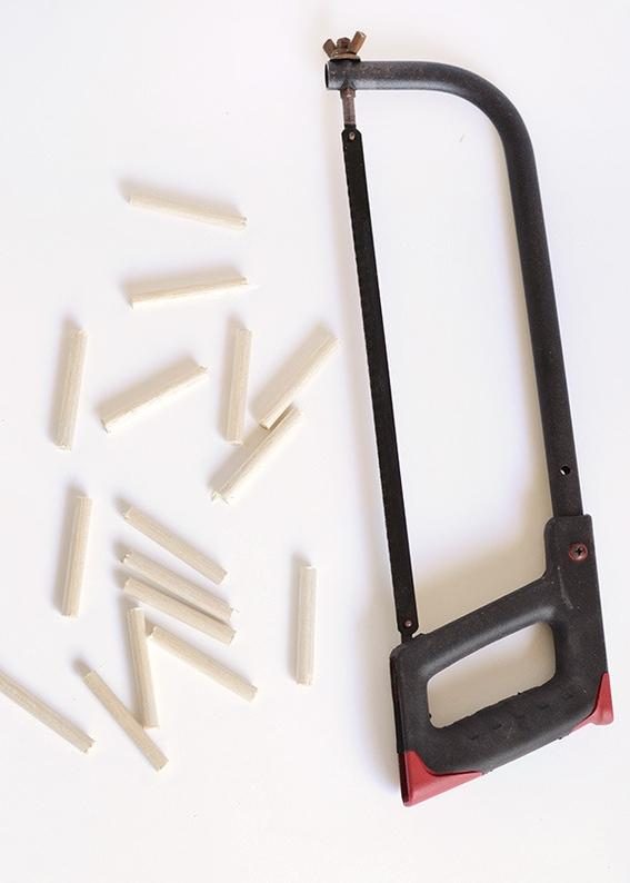 Распилите деревянную жердь на отрезки, длина которых будет соответствовать сторонам деревянных квадратов.
