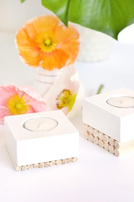Совет: не обязательно красить подсвечник в белый цвет, краску вы можете подобрать на свой вкус. Поэкспериментировать можно и с количеством слоев, а также расположением жердочек, формирующих основание подсвечника.