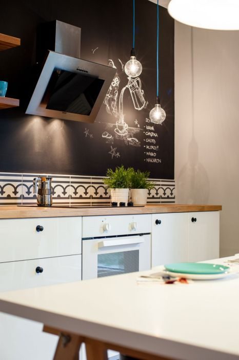 Сложности различной степени являются настоящим вызовом для профессиональных архитекторов. При любых препятствиях они стараются сделать пространство максимально практичным и привлекательным. Так получилось и с этой небольшой квартирой. Стены во всей квартире решили покрыть грифельной краской серого и чёрного цвета. Это решение позволило сэкономить на обоях.