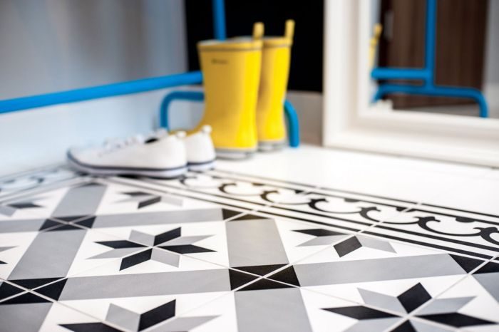 На пол постелили ламинат хорошего качества, а для прихожей приобрели геометрическую плитку на распродаже. Остатками плитки украсили кухонный фартук, как говорится, одним выстрелом убили сразу двух зайцев.