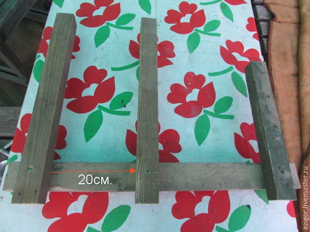 4. Брусок — 73 по горизонтали. Отступая от краёв и вниз по 5 см, прикручиваем (лучше на жёлтые саморезы, сначала просверлив маленьким сверлом) два — 54 и один — 39 по вертикали. Внимание: расстояние между двумя — 54 — определяет наклон спинки. Чем расстояние меньше, тем спинка будет более поднята по вертикали. Чем больше — тем опустится вниз. Я взял расстояние между брусками 20 см. Затем готовим такую же левую боковину, зеркально. Если у кого-то появятся сомнения, можно скручивать снаружи и изнутри. Хотя брат сколотил просто на гвоздях и десять лет оно стоит на улице и ничего!