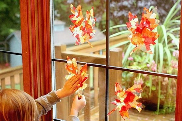 Помните, как украшали к Новому году окна бумажными снежинками? Эта же идея может быть использована и в осенней теме. Красивые листочки можно вырезать из яркой бумаги или остатков ткани. А выглянувшее солнце добавит настроения и заиграет осенними красками на Ваших окнах.