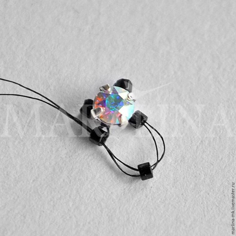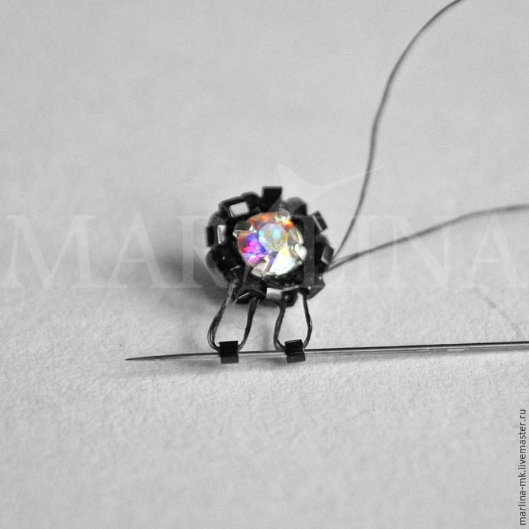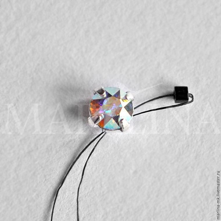 Отрезаем нить, надеваем одну бисерину 11-го размера на нить, затем оба конца нити продеваем в ушко иглы и проходим иглой через две дырочки пришивного кристалла.