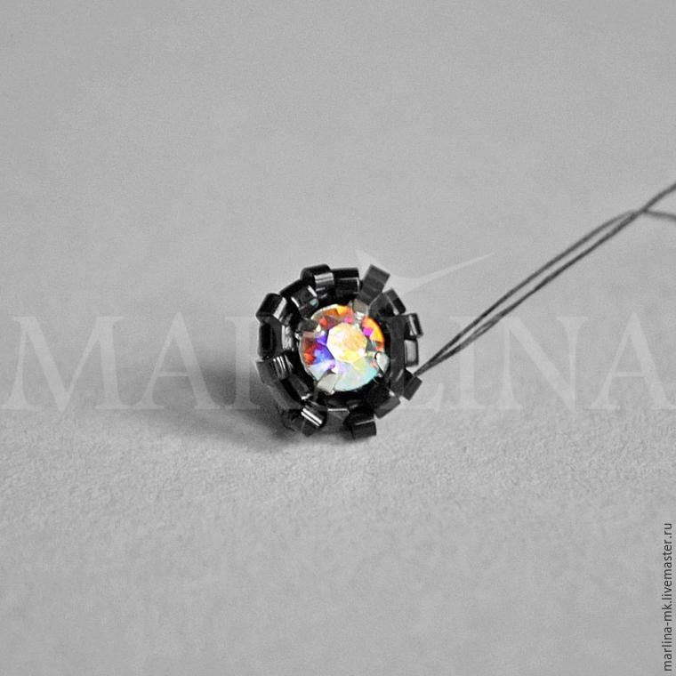 Так проходим по кругу, добавляя по две бисерины. В последнем круге нам остается добавить всего одну бисерину. У нас получилась на кристалле шапочка, которую нужно стянуть — проходим нитью по кругу, стягивая верхние бисерины.