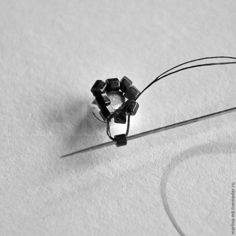 Проходим нитью круг из 8-ми бисерин, подтягивая их к друг другу. Затем плетем ряд мозаикой, вплетаем четыре бисерины 15-ого размера.