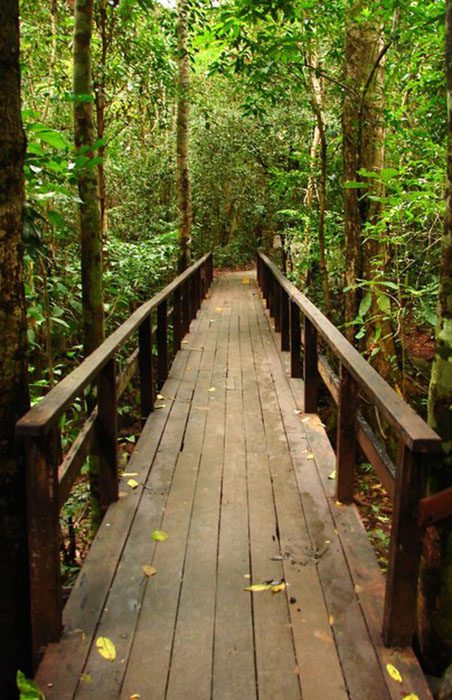 На этой фотографии своеобразный мост, он прямой, но благодаря образу в целом и близости леса заставляет фантазировать и придумывать историю, которую лес, безмолвный свидетель, мог бы рассказать. Вытянутая конфигурация дорожки заставляет устремлять взгляд вдаль, и дорожка кажется длиннее.