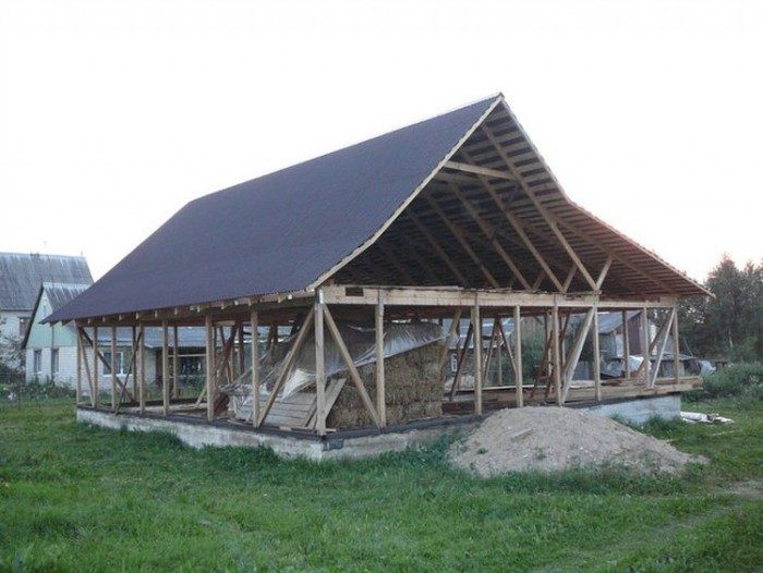 Основные строительные работы Александр с отцом выполняли летом-осенью 2013 года. В июле на уже готовом фундаменте был собран деревянный несущий каркас. В августе каркас накрыли крышей, и лишь потом началось заполнение стен соломенными блоками. Тюки при этом размещались под крышей, чтобы солома не мокла под дождем.