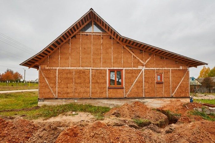 Блоки соединялись специальными деревянными штырями, а стыки между блоками плотно затрамбовывались свободной соломой. Затем стены подстригли электропилой для выравнивания, углы обложили мелкой металлической сеткой, после чего снаружи был нанесен первый слой раствора глиняной штукатурки. Технология требует наносить три слоя штукатурки (по 1 см каждый) снаружи и изнутри дома.