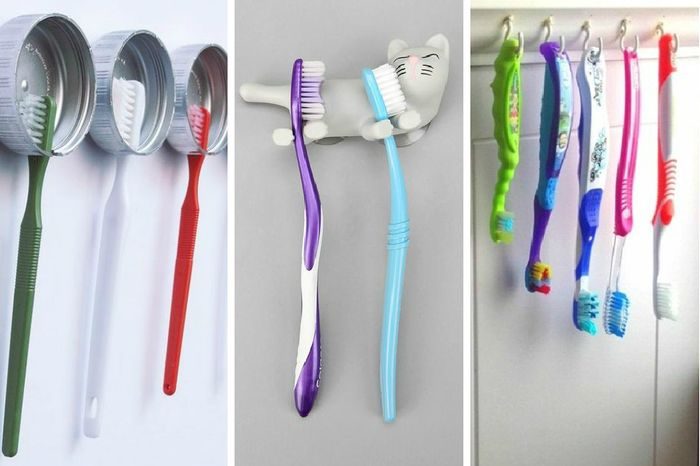 Специальные дырочки есть не на всех щётках. В этих случаях придут на помощь даже самые обычные прищепки или консервные банки, из которых можно сделать оригинальные органайзеры для щёток.