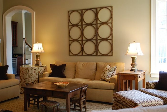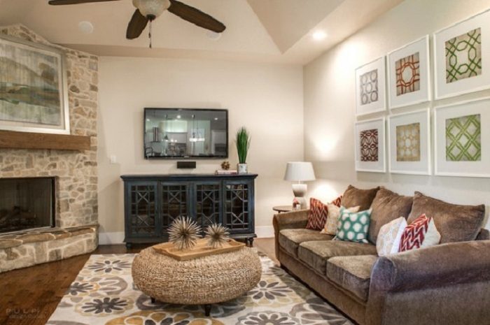 Уютная атмосфера гостиной с таких теплых тонах и с деревянным столиком.