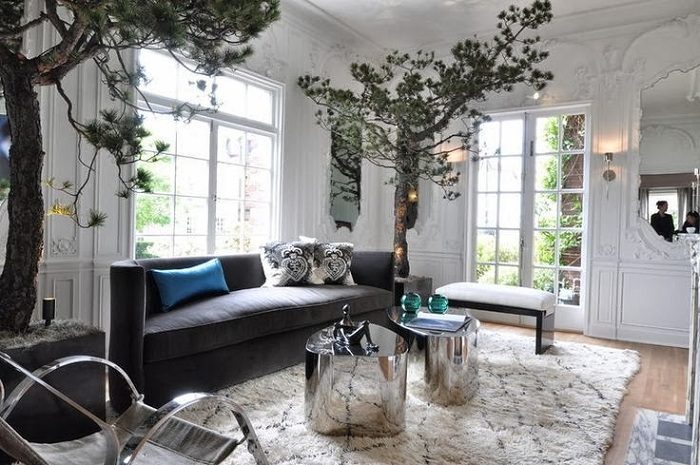 Причудливый интерьер гостиной комнаты с невероятными деревьями по углам и симпатичными круглыми столиками.