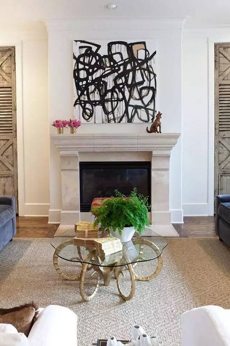 Оформление гостиной с камином, картиной и не менее привлекательным столиком.