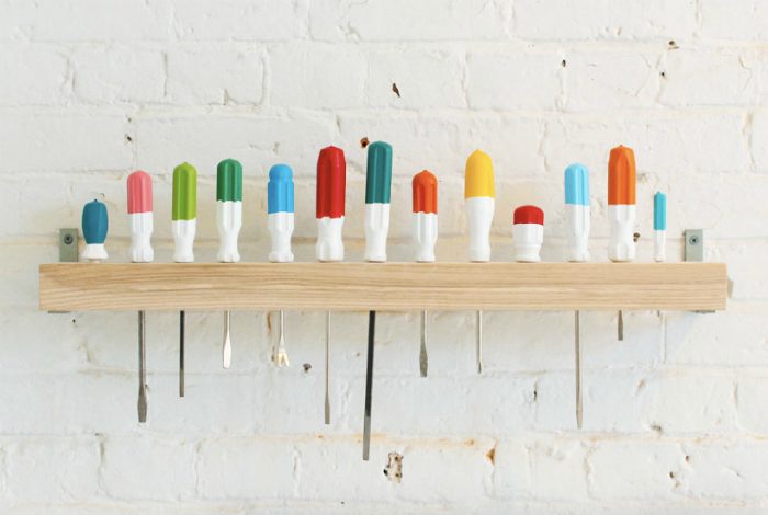 Деревянная полка с отверстиями для удобного хранения отверток разных размеров.