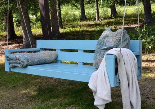 И остается подвесить просохшие и окрашенные качели. Подвешивайте их на каркасе сиденья к боковым дощечкам — ведь на это место приходится больший вес. А чтобы увеличить уровень комфорта, автор подвесил готовые дачные качели под углом около 50 градусов.