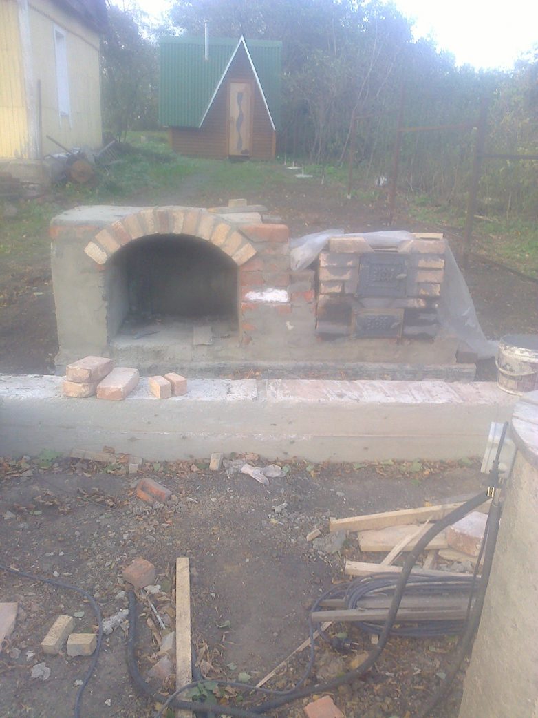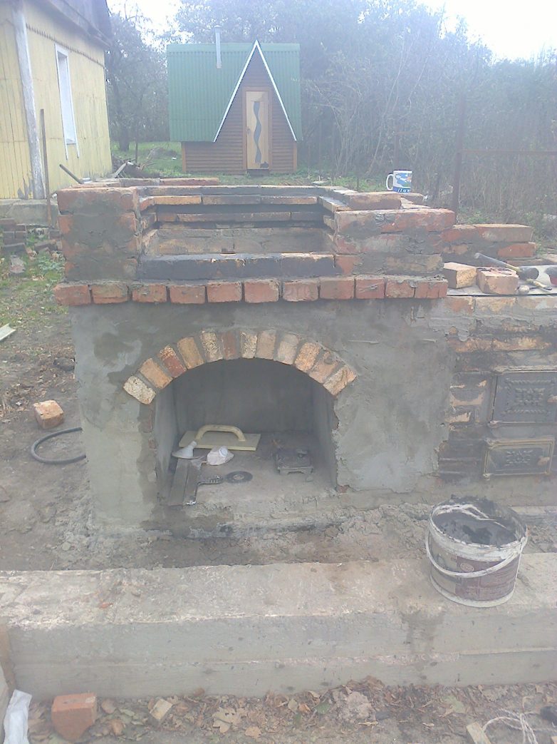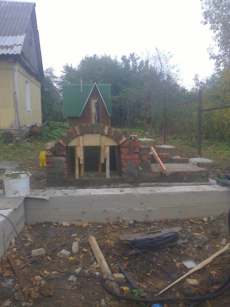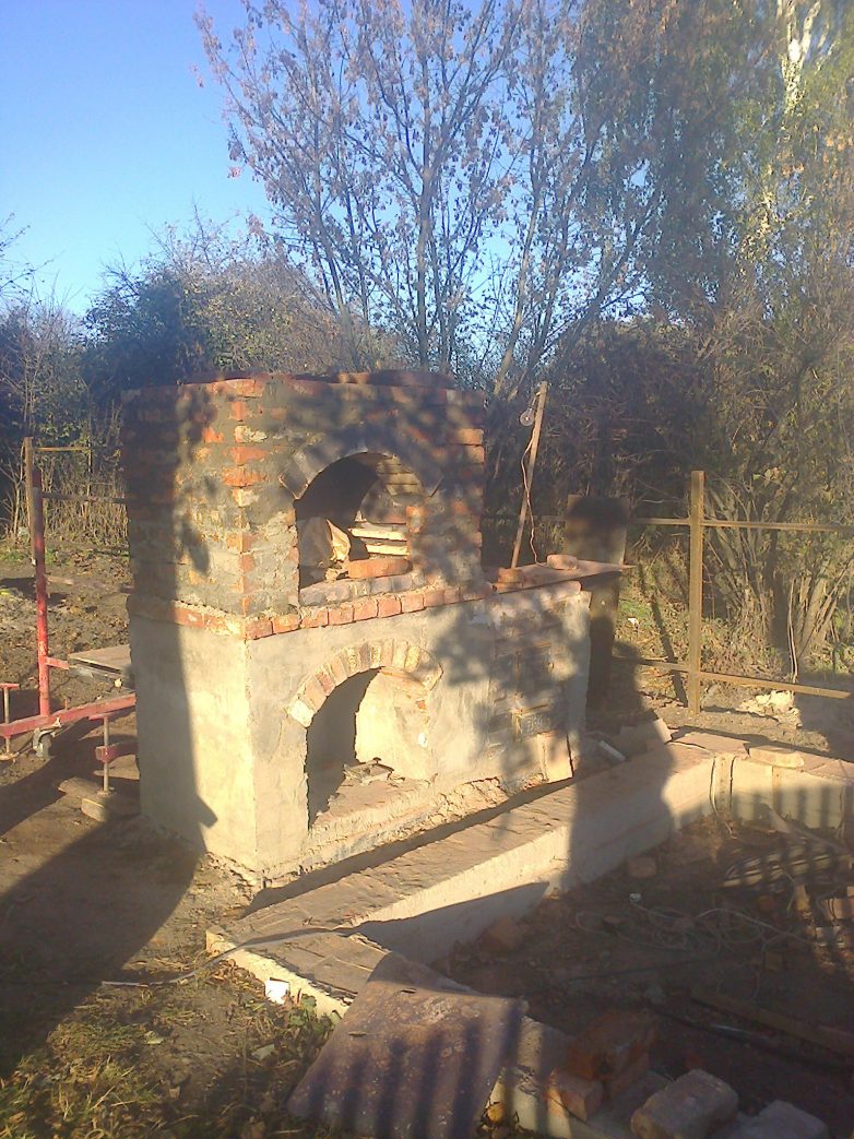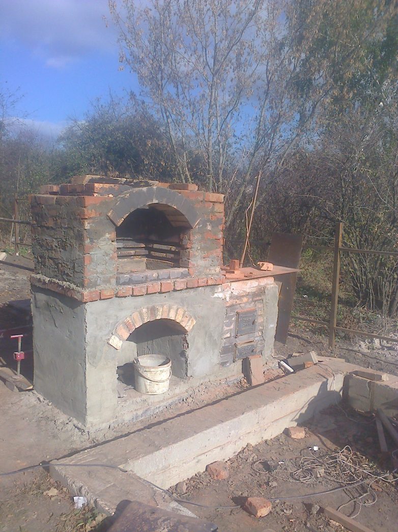 Ну вот как то так. Из материала ушло почти 1500 кирпича бу по 6 руб. плюс 3 дверцы, колосник и плита еще 4000 руб. Песок у меня был цемента по памяти мешка 4 не больше. Да еще впалил 3 алмазных круга. Пилить кирпич это жесть. Мешки привез со стройки в них вывозил мусор потом, а то будете спрашивать зачем тебе пескобетон был нужен. За сим все начались холода оставим все до весны. Будут новости отпишусь. Всем БЛАГ.