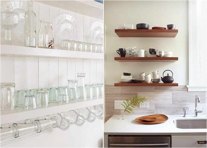 Существенным минусом таких полок можно считать то, что на них скапливается пыль и жир. В таком случае, если вы часто и много готовите, такие полочки лучше заменить традиционными настенными шкафчиками. Но в основном открытые полки являются прекрасным вариантом и всегда можно найти выход.