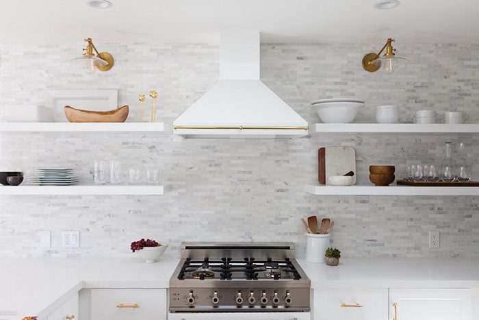Используйте открытого плана полки, чтобы разбавить белый фон. Если в абсолютно белой кухне чувствуете себя как в больничной палате, тогда установите открытые полки, которые добавят красок. Благодаря цвету материалы, из которого изготовлены полки, и цвету тех предметов, которые вы на них поставите, включая, заварочные чайники, кружки и другие аксессуары, кухня заиграет по-новому.
