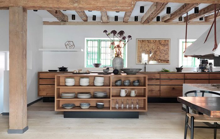В этом коттедже в кухне полки расположены близко к потолку и заставляют, входя в помещение, поднимать глаза вверх. Кроме того, такое расположение балансирует всю композицию. Но ведь это не практично, каждый раз брать лестницу, чтобы что-то достать. Поэтому, в таком случае, на полках уместно поставить декоративные предметы, например, корзинку для пикника, старинные коробочки и т.д.