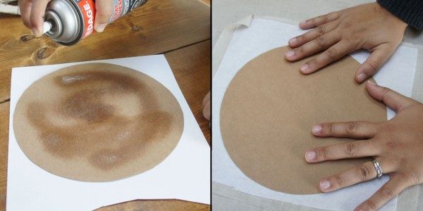 7. Намажьте клеем ПВА картонный круг (можно взять клей в баллончике), проследите, чтобы не осталось сухих мест, излишки клея уберите. Приклейте картон к куску ткани белого цвета. Это нужно проделать для того, чтобы картон не просвечивал через циферблат часов. Дайте работе хорошенько просохнуть.