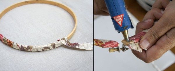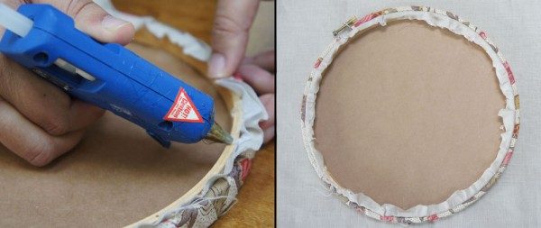 10. С помощью клеевого пистолета приклейте края ткани по кругу к меньшему кольцу пялец. Будьте осторожны, чтобы не получить ожог от горячего клея.