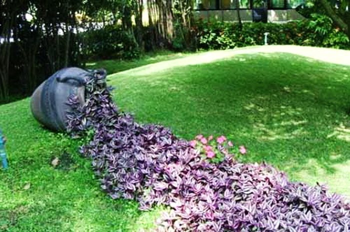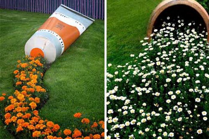 Почти все мы видели клумбу «Цветочный ручей» в интернете, когда растения как-бы «вытекают» из опрокинутого на бок цветочного горшка или другой емкости.
