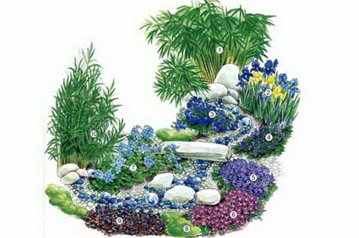 1 — бамбук-листоколосник, 2 – гибриды ириса бородатого, 3 – лобелия, 4 – живучка ползучая, 5 – колокольчик Посхарского, 6 – гибриды обриеты, 7 – брунера крупнолистная, 8 – мшанка шилолистная, 9 – живучка ползучая краснолистная, 10 – арундо тростниковый.