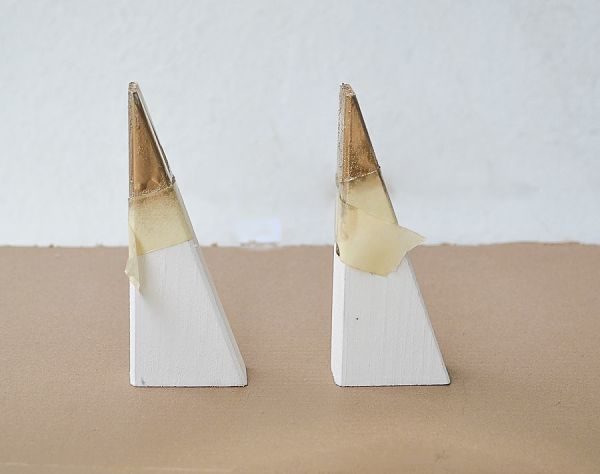 После того, как треугольники отполированы, окрасьте их краской из баллончика или кистью белой краской и подождите, пока она высохнет. Используя ленту или малярный скотч, отметьте верхнюю зону, если хотите покрасить ее в другой цвет (в нашем случае золотой). Так Вы получите четкую границу, разделяющую два цвета.