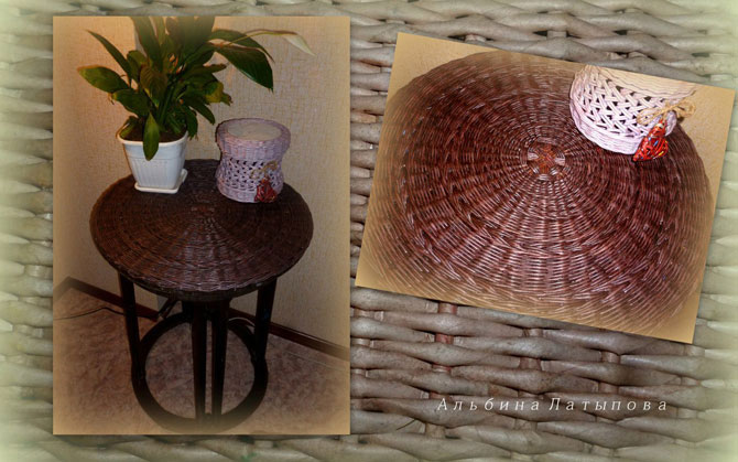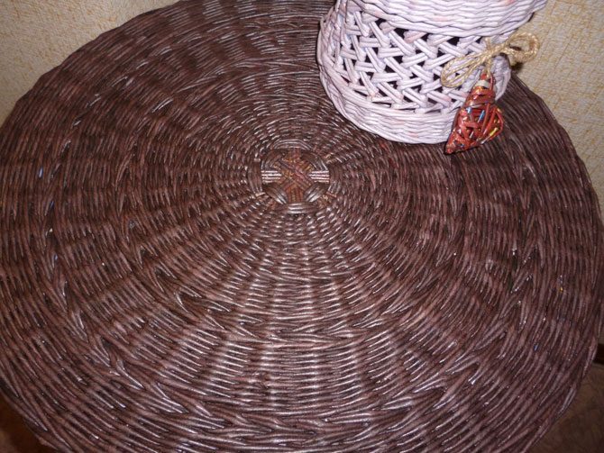 Столешницу начала плести с центра. Для стоек скрутила трубочки из глянцевых каталогов. Такие стойки прочные и упругие. Удобно и то, что их не пришлось красить. Плела узором «верёвочка», добавляя в процессе стойки.