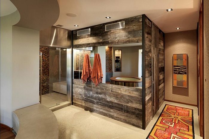 Идея попотеть в сауне, когда на улице бушует зима и непогода, понравится многим. Эта ванная предлагает объединить роскошное спа с оригинальным дизайном, присущим саунам Швеции и Финляндии. И не последнюю роль здесь играет б/у дерево, которое помогает визуально отгородить жаркий уголок от всего остального мира.