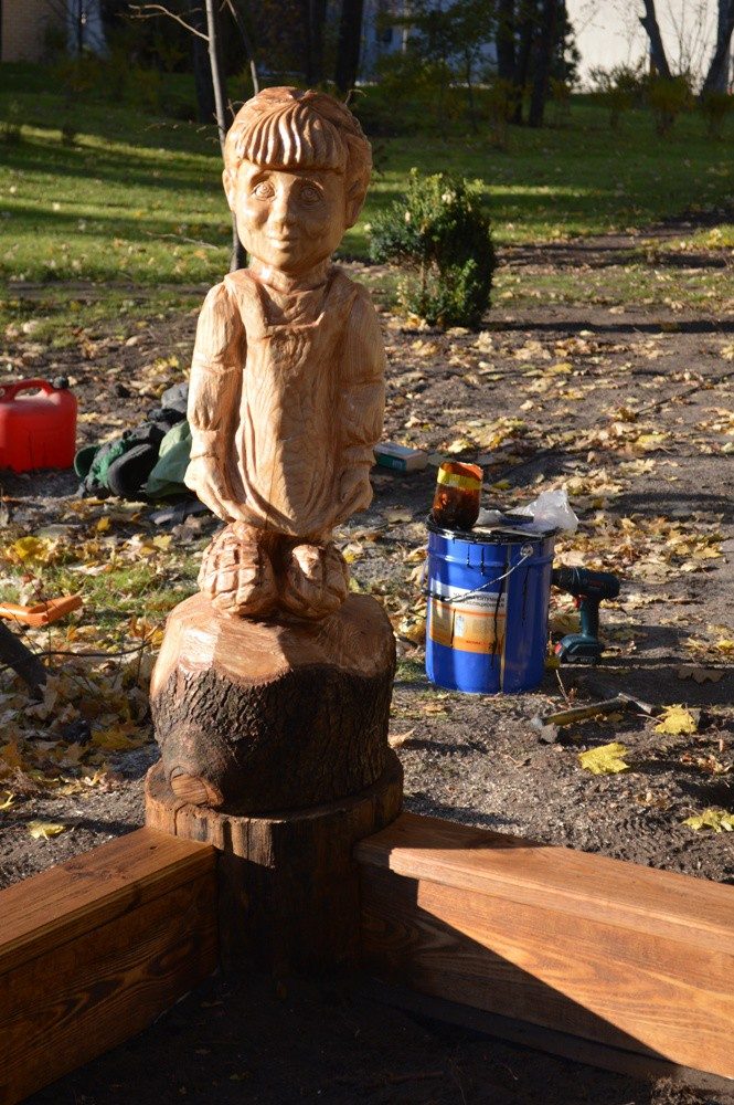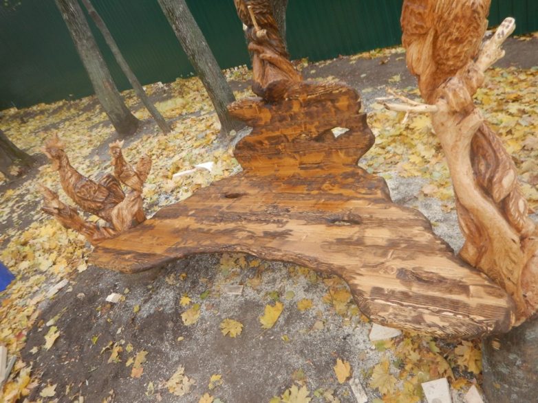 Местные стали ходить ко мне на экскурсии. Женщины с ведерками – опилки собирать. Мужики – рассказать мне про тонкости эксплуатации бензопил. Дети – полазить по фигуркам. Так что даже надгробия перестали нагонять тоску. Конец дня. Пропитана, покрашена, готова к употреблению. В этот же день делал табуретку и козу – из прошлой темы. Ну а вечером перешел к следующему бревну