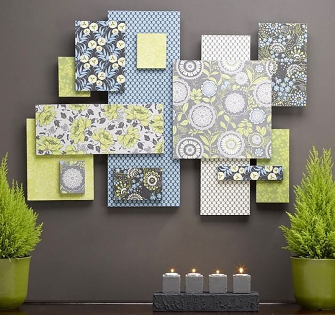 Замечательный декор для стен можно сделать из крышек от коробок, обклеенных цветной бумагой.
