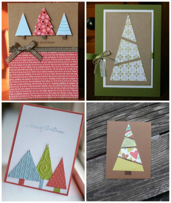 Очаровательные открытки с елочками, которые можно сделать из лоскутов обоев, ткани, старых журналов или цветной бумаги.