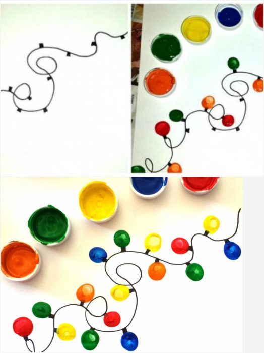 Чтобы сделать такую открытку, сначала на белом картоне нужно изобразить закрученный шнур, а потом изобразить яркие лампочки с помощью отпечатков пальцев, смоченных в краску.