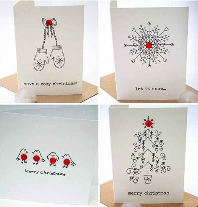 Удивительные открытки с простыми рисунками, украшенными яркими пуговками.