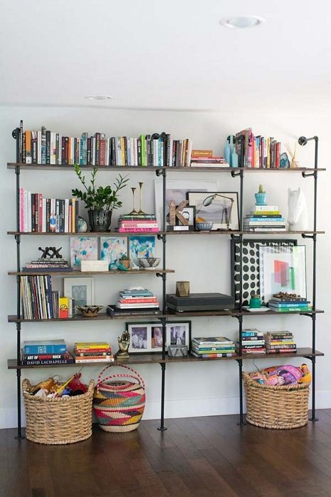 Трубы с закрепленными на них полками отлично впишутся в интерьер комнаты или гостиной.