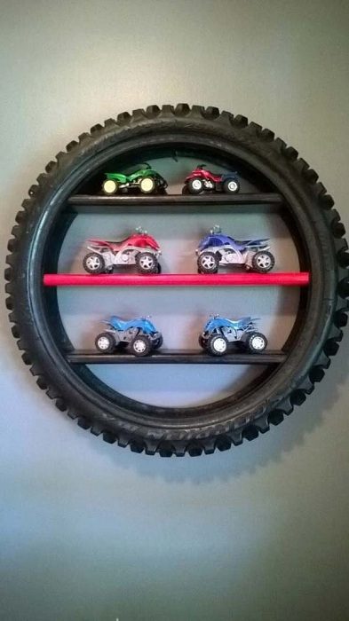 Нестандартное решение создать полочки в колесе и разместить его на стене, создаст специфическое настроение.