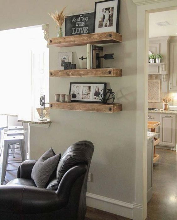 Красивые и на первый взгляд простые деревянные полки станут прекрасным элементом декора в гостиной комнате.