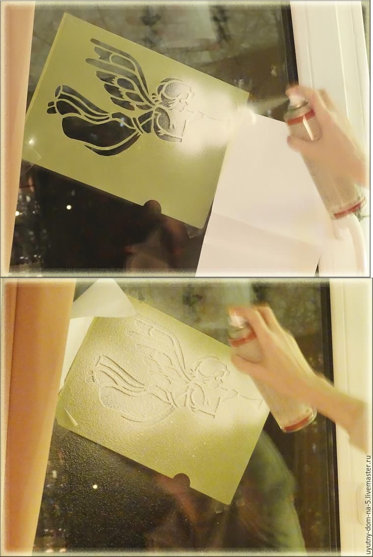 Теперь наша задача покрыть трафареты снегом. Рекомендую покупать хороший немецкий спрей. Снег очень качественный, баллончика хватает на такой декор 5-6 окон. Пробовала использовать отечественный дешевый снежок -—очень разочаровалась. Стоит он, конечно, в несколько раз дешевле, но одного баллона с трудом хватает на одного ангела и одну деревеньку. Качество покрытия очень неравномерное.