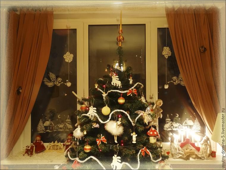 На фото плохо видно, но на стекла я еще приклеила снежинки, а на карнизы привязала снежинки со снежками. Этот замечательный новогодний декор связала крючком моя дочь. И некоторые игрушки на елке мы делали с ней сами, например домики.