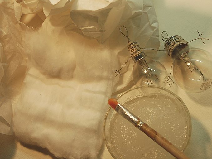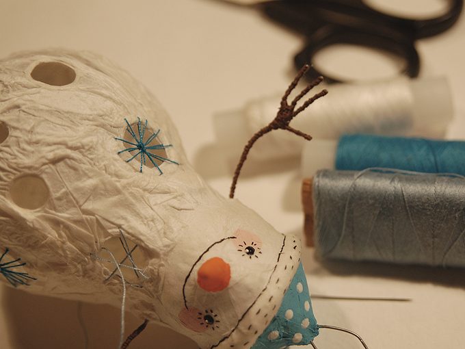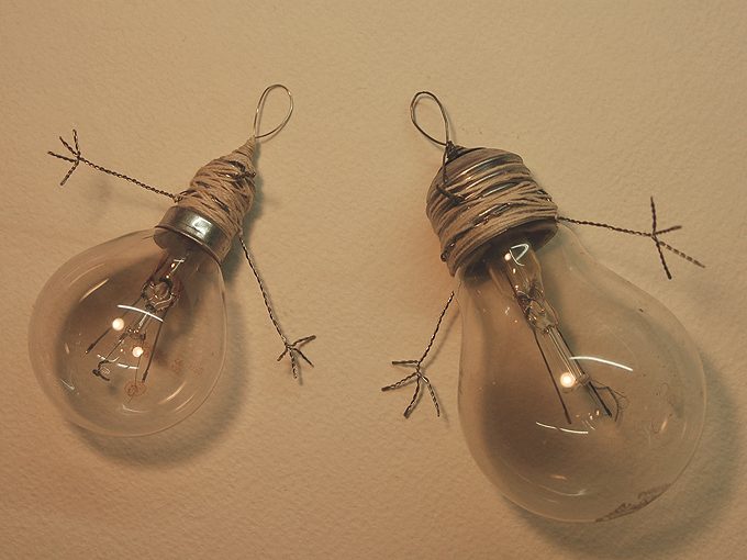 Из проволоки также делаем носы и петельку (можно сразу сделать крючок, а не петельку). Нитками приматываем это все к лампочке в нужных местах. Таким образом мы крепим проволочные элементы, а также создаём основу для лучшего сцепления бумаги и ваты с лампочкой.